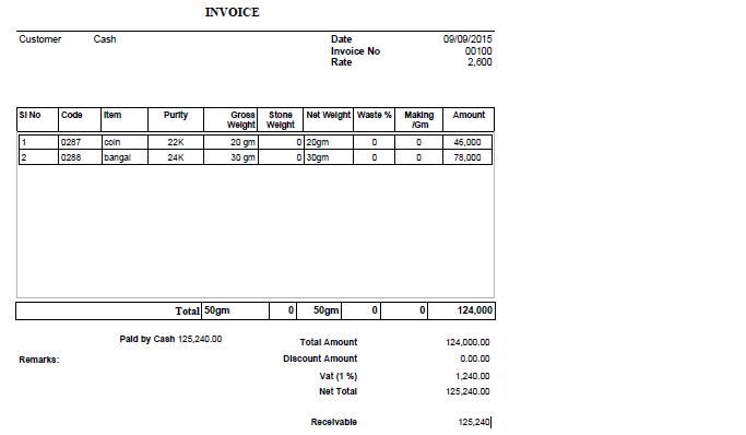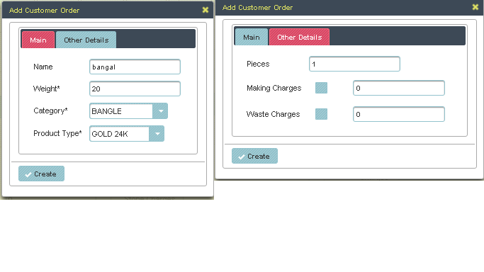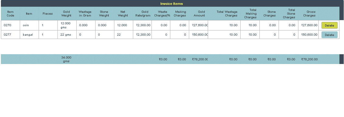Here first in the main, enter the name of the product then enter the product weight, and select the category and finally select the product type. In other enter the no of pieces, making charges and waste charges and click on create.Once you click on create button the product will create and it stored in data table. In the above fig shown all data. Their you can enter waste charges, making charges and also stone charges, it will change the net amount, gross amount and all depends upon those charges. Depends upon gold weight, product type, waste charges and all net amount, gross amount, vat and all will come. If you want to delete the created product, you just click on delete button.