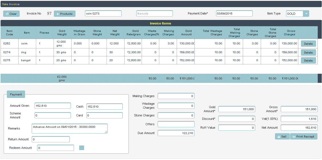 And also in top of the right side, there is a option called payment date, when customer will pay the money to bye a product, that day you select the date and sell the product. And also select the item type either gold, silver or diamond whatever customer wants.