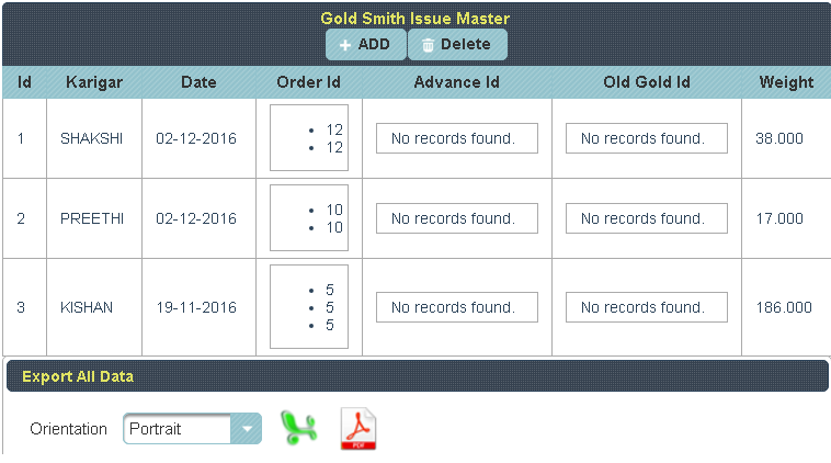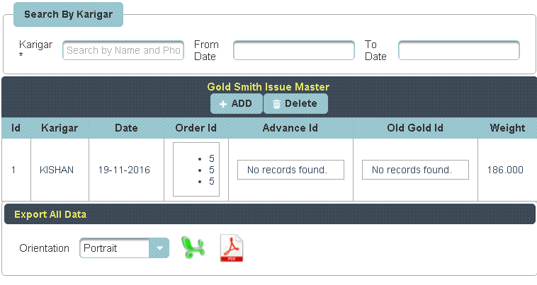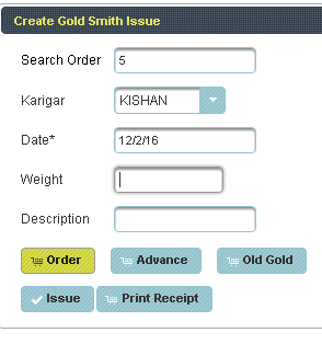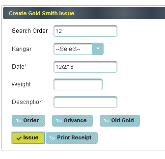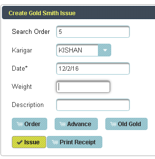Gold Smith Issue Voucher This menu helps in issuing orders to the Karigar given by the Customers. |