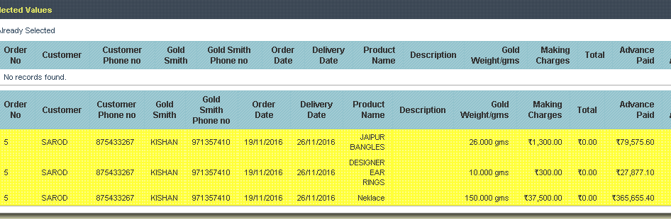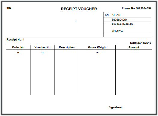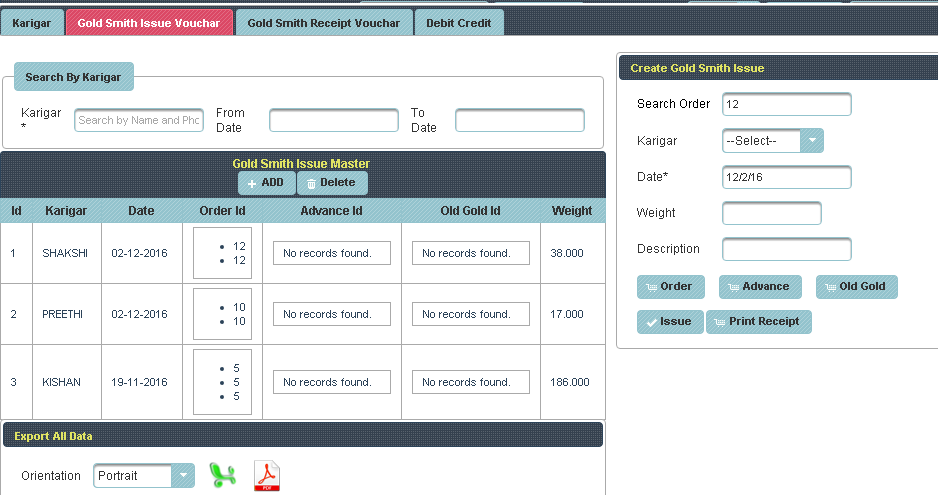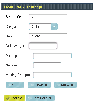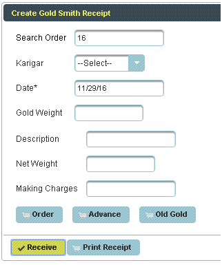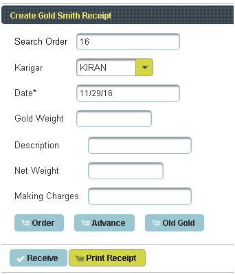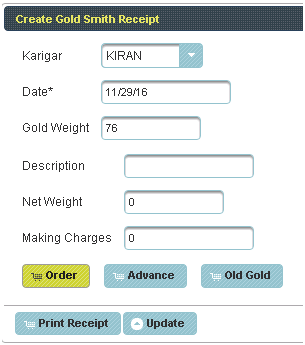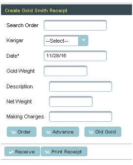 Gold Smith Receipt Voucher This menu helps in receiving orders from the Karigar given by the Jewelry shop. |