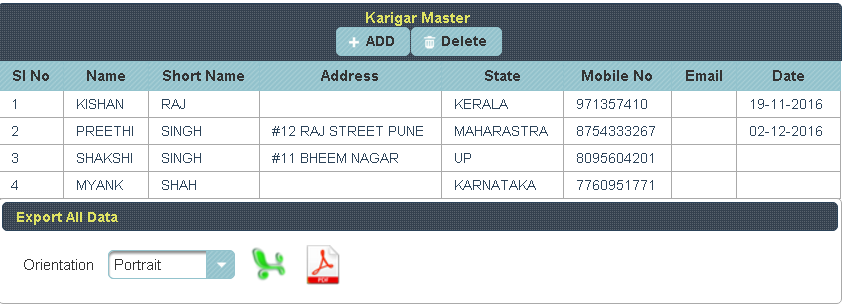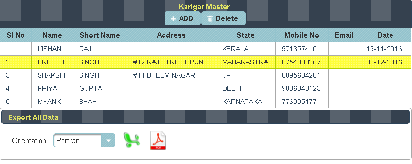 To Delete the details of Karigar, Select the Name of Karigar in Table and Click on Delete. |