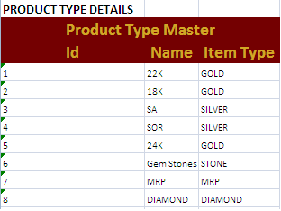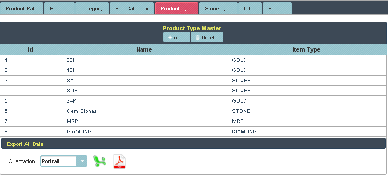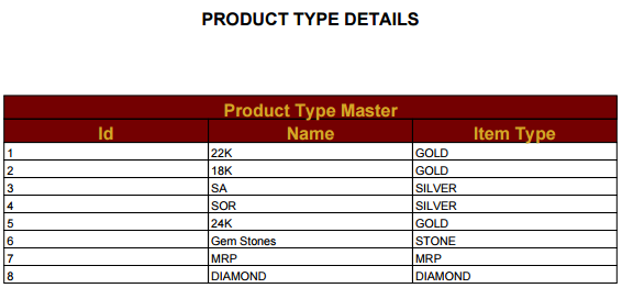 | Product Type This menu is just for creating product type names say 22K, 24K, SA, SOR etc. and assign corresponding item type like gold, silver, diamond and all. |