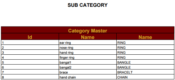 | Sub Category This menu is required to create sub category for category. for example if more than one sub category for one main category, then create sub category for that main category. ex: Ring have many category like ear ring, hand ring,nose ring and all for that select main category then enter sub category to create. |