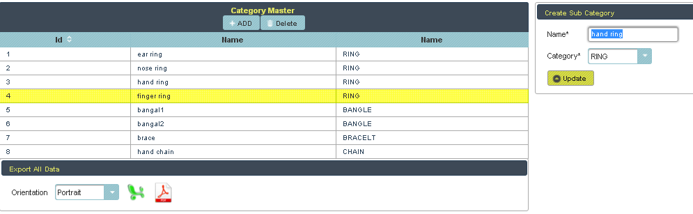 If you want to change the name of sub category, just select the row in the table change the name in left side then click on update, then it will change. The following fig shows that option.