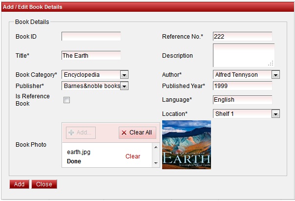 Repeat the above steps to add all the Books in your School. Once all the books are added click on Close button to close the Add/Edit window.