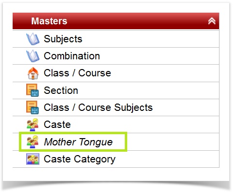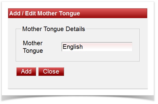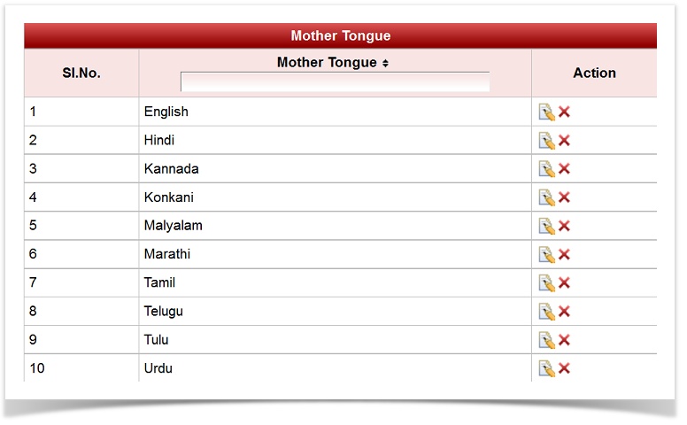 Upon clicking Mother Tongue module, Mother Tongue page will be displayed as shown below.