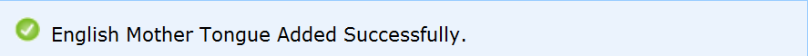 Upon clicking Add button a success message will be displayed as shown below indicating that the Mother Tongue is successfully created in the software.