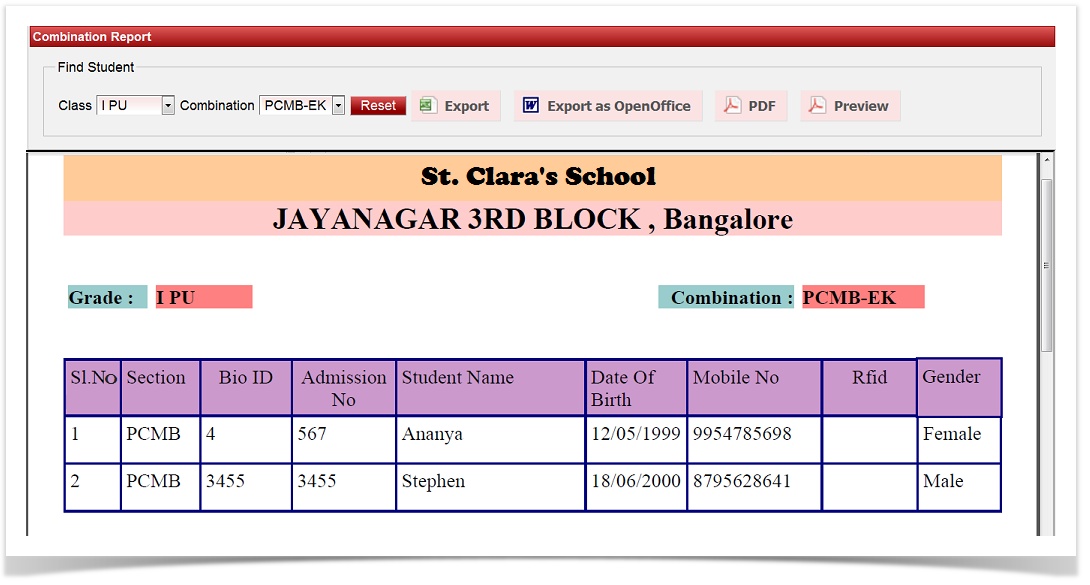 To get the students list of a particular combination opted in each class, Student Combination Report can be generated.