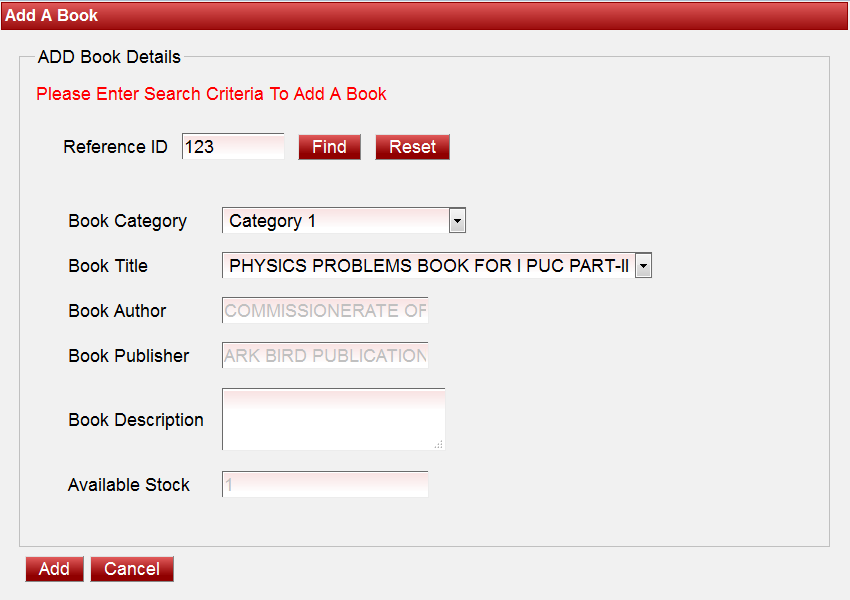 Upon clicking Add Book button a page will be displayed as shown below.
