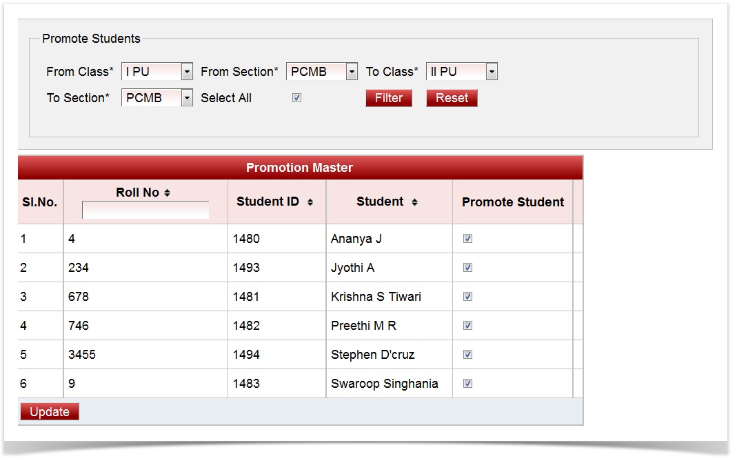 Once after promoting the students, you can switch the Academic Year from settings to view the students in the promoted class / next higher class. |