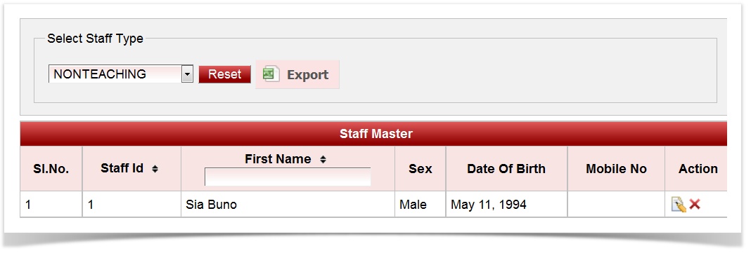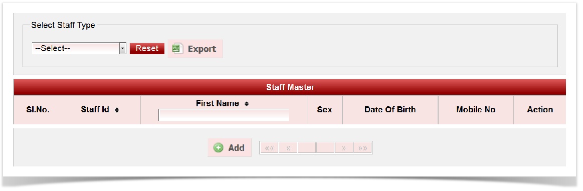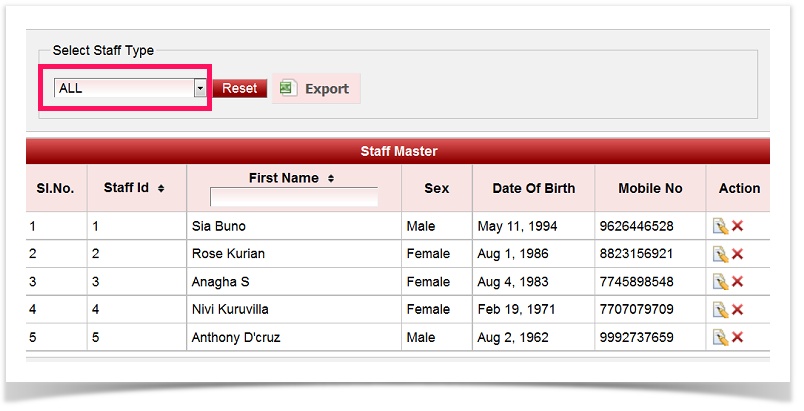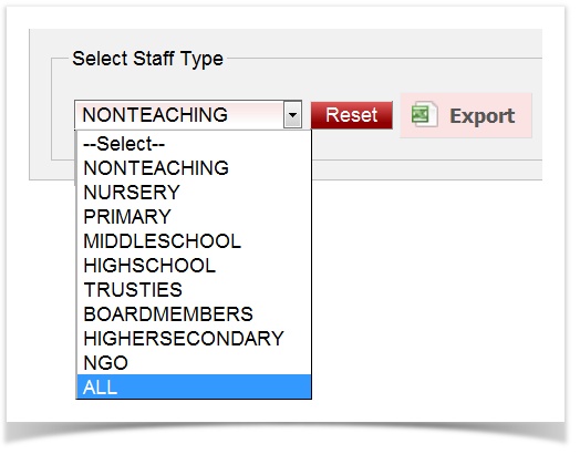 When a staff belonging to another staff type has to be searched, click on reset button before selecting another staff type. |