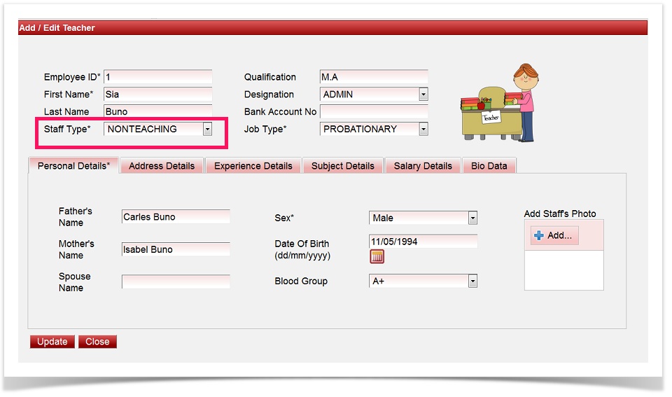 The staff type will be assigned to staff at the time of adding the staff, as shown below. |