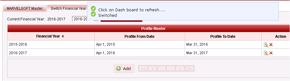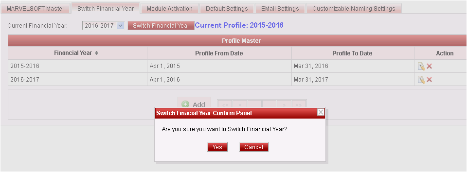 On clicking Yes button, the switch in the academic year is done and the message is displayed as shown