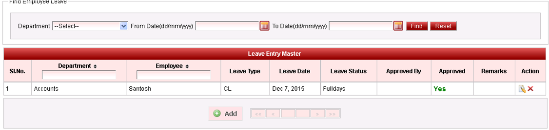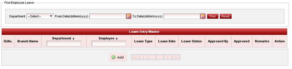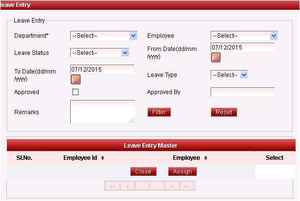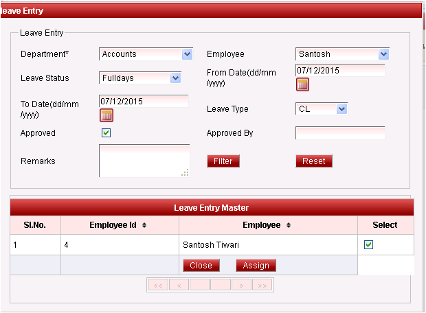 Step 2: Select the department, employee, leave status, from & to date, leave type & enter the remarks then click on Filter. The Leave Entry Master will reflect the details then click on select.