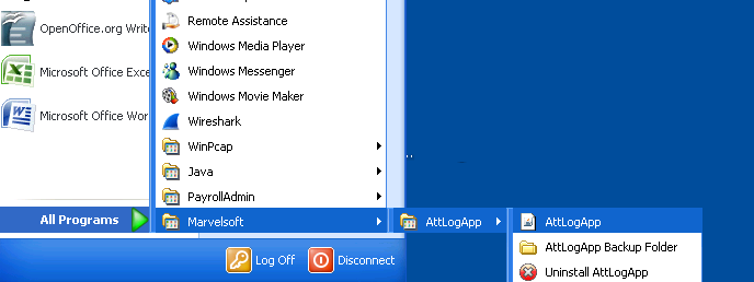 To open the AttlogApp, click on Start -> All Programs -> Marvelsoft ->AttLogApp -> AttLogApp.jar