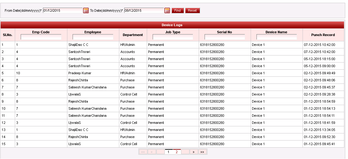 To know know the logs in the device, select the date range. Logs are displayed as shown below