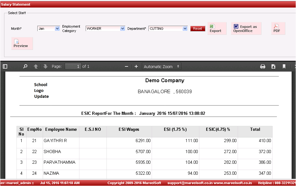Select the month, employment category and department. Click on Preview or PDF. To export thr file in excel, select export option.