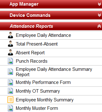 On clicking ATTENDANCE REPORTS tab there are certain sub tabs as shown below.