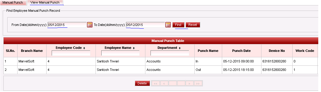 To view the entries done through manual punch.Click View Manual Punch.Select the date range and click on find.