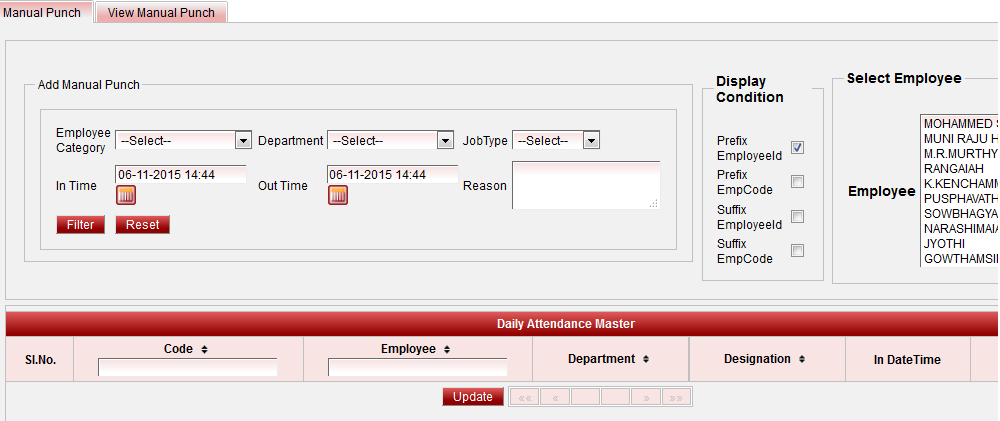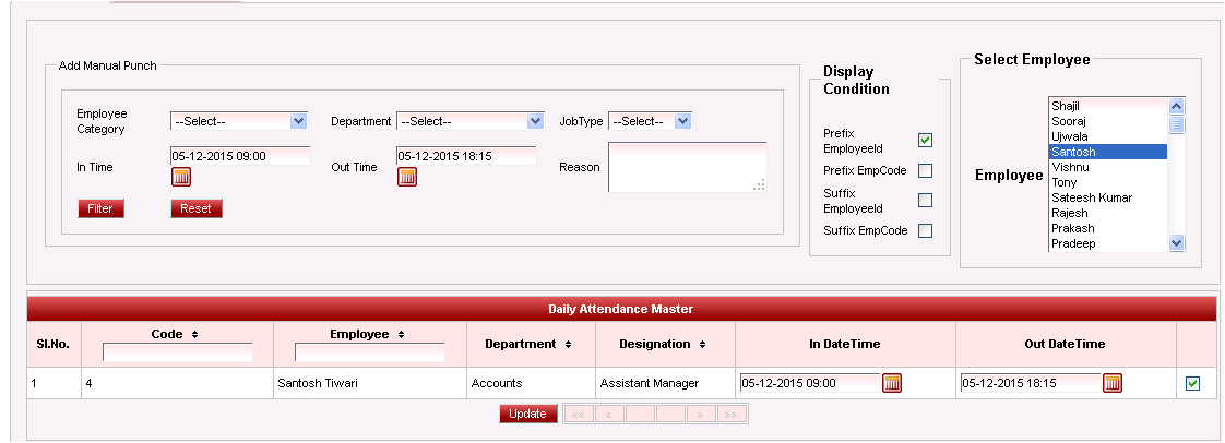 After the employees are listed, select the check boxes on the right hand side against the employees for whom the manual punch has to be assigned and then click on the "Update" button.