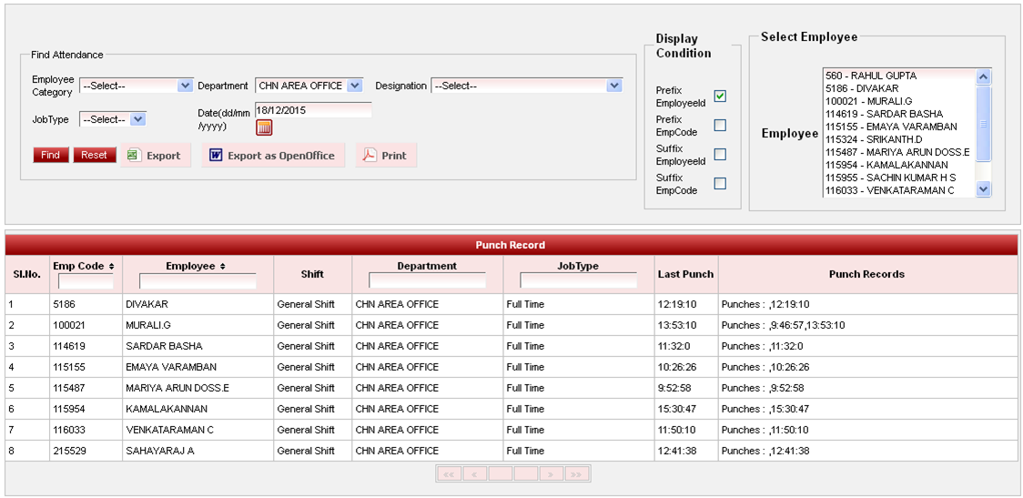 Click on Punch Record, and select department, employee category, designation and date to view all the employees meeting the criteria