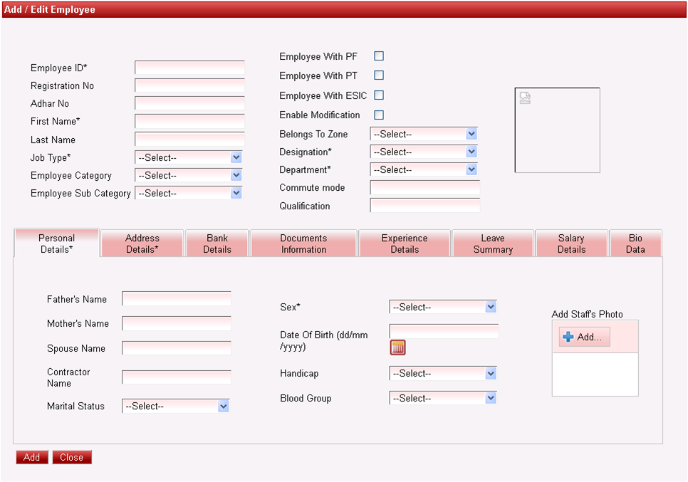 This menu will allow the user to Add, Edit or Delete an employee. All the details associated with employee details can be maintained in this form. |