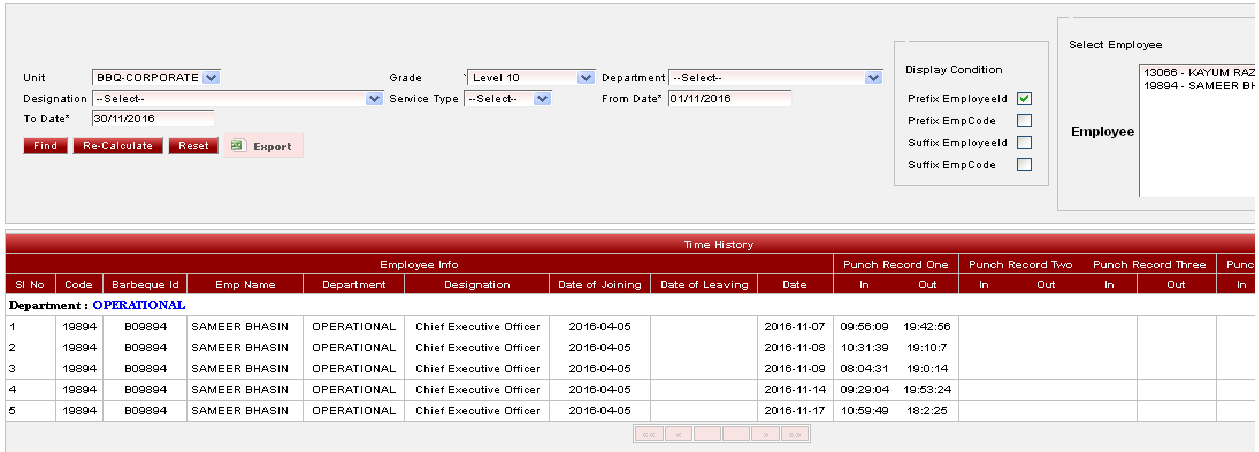 In this report we can view Time History Of Employee where we can view the punch records,Total duration and OT of an employee for the corresponding month . |
