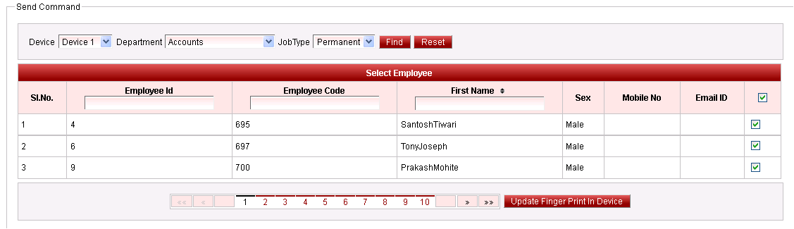 In this menu, we can send the command to the device to update the fingerprint of the employees from the software database.