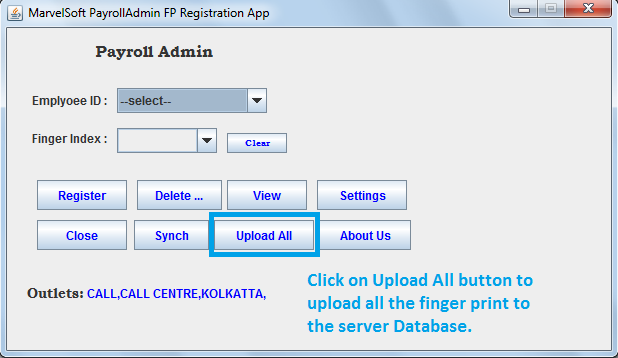 On clicking Upload All button all the finger prints captured will be uploaded to the server Database.