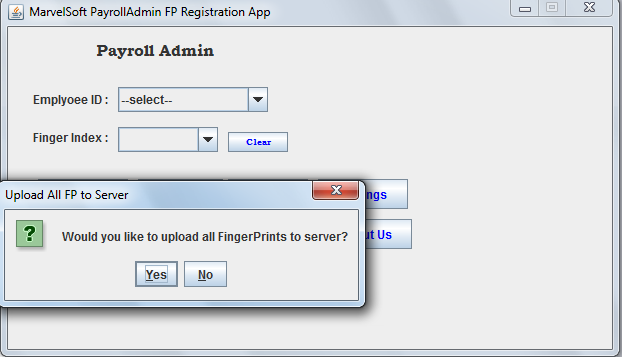 | Upon clicking Upload All a dialog box with message ‘Would you like to upload all FingerPrints to server?’ will be displayed as shown below.