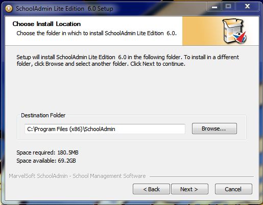 Select the Drive and Folder where you would like to install SchoolAdmin. Ensure that the Drive where you are installing the SchoolAdmin Lite has minimum 10GB free Space.