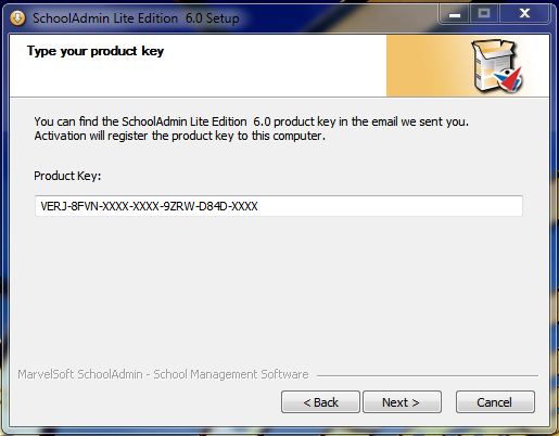4. Type the product key printed on your SchoolAdmin DVD disk or if you have downloaded the software by making payment online. check your email if you have received the product key by EMail.