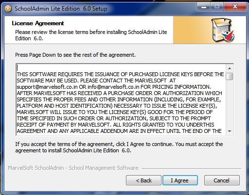 2. In this Screen you will see the SchoolAdmin Installation License agreement, read through the license agreement and if you accept the license agreement click on I agree button.