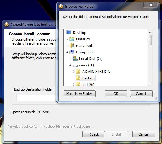 6. Select drive and folder where MarvelSoft SchoolAdmin Lite server has to create daily backup of the database.then click on Ok. then click on Install button. Installation of SchoolAdmin server will begin. Backup folder should be in a drive where your windows is not installed. If Windows is installed in C drive. select D or E drive and create a folder and select that folder to create backup.