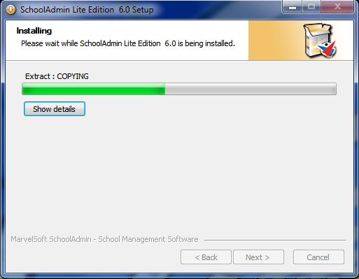 You can see setup.exe file in the DVD disk. click on the setup.exe file to begin the installation. you must be logged in as Administrator in Windows before installing SchoolAdmin Lite edition. Before you start the SchoolAdmin installation, close all other applications running on your system. This will help installing SchoolAdmin server on your system smoothly.