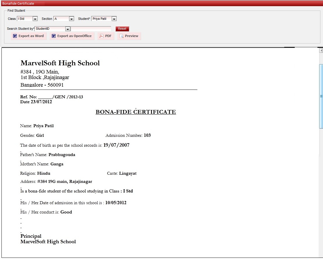 Click on Bonafide Certificate, user will be able to view the below figure.
