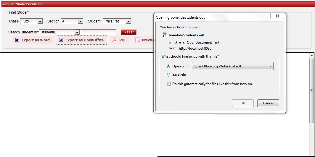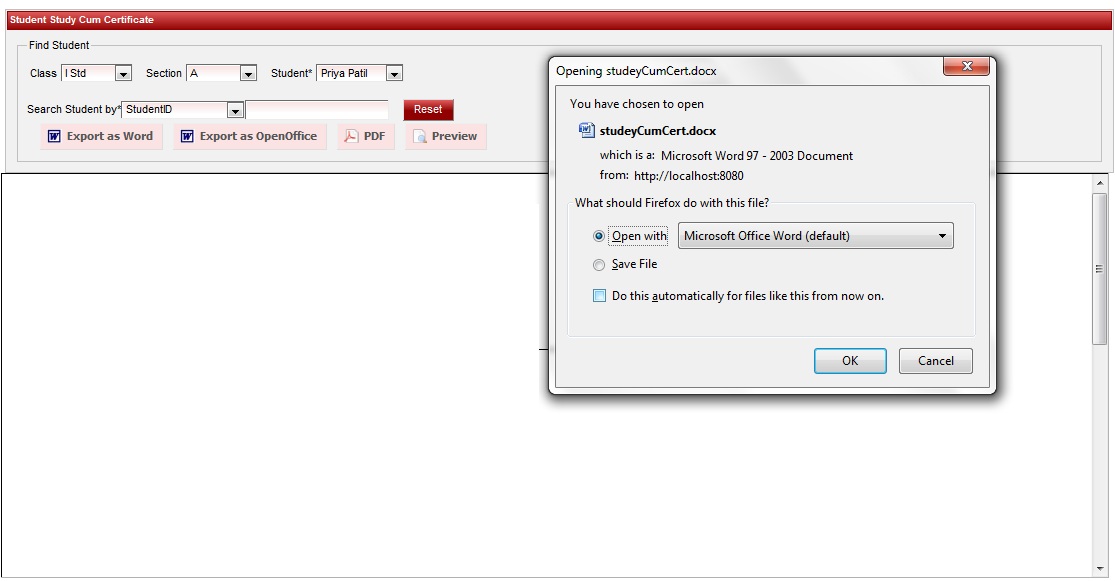 Click on OK to generate the certificate in Word format as shown below. Take the print on your school letter head which has the address of your school.