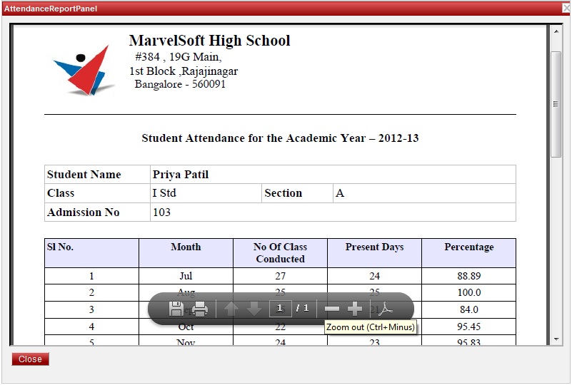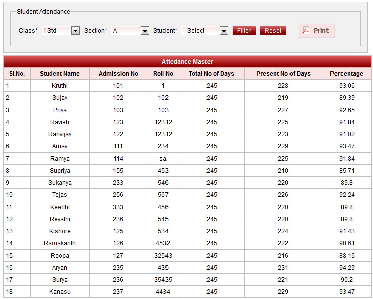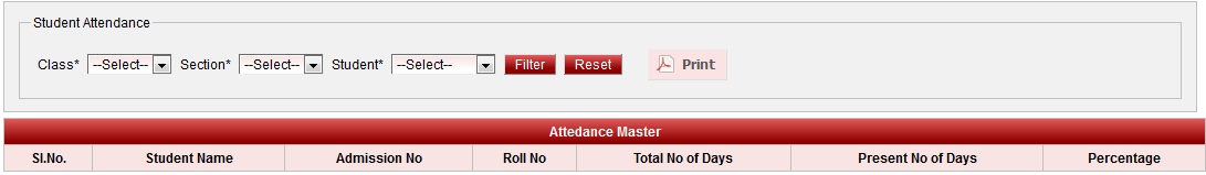 User must select Class , section and Student to fetch the attendance details and print the report.
