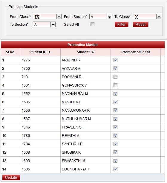 2. Do not select if the student is detained / left the school / to be demoted. If all the students are promoted , click on Select All option. 3. Click on Update button. Promote all the Students in the same manner. And then switch to next year in Settings.