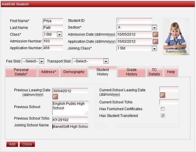 5. Check mark Has Student Transferred. If you have issued TC (School Leaving) certificate for the respective student check mark Has Furnished Certificates. Click on update button. You must complete this step for all the classes and mark TC take students. If you do not know at this point, you can simply promote every one and later you can issue the Transfer certificate. However for the highest class, such as 7th STD, 10th STD or 12th STD students you must set them Transfer flags.