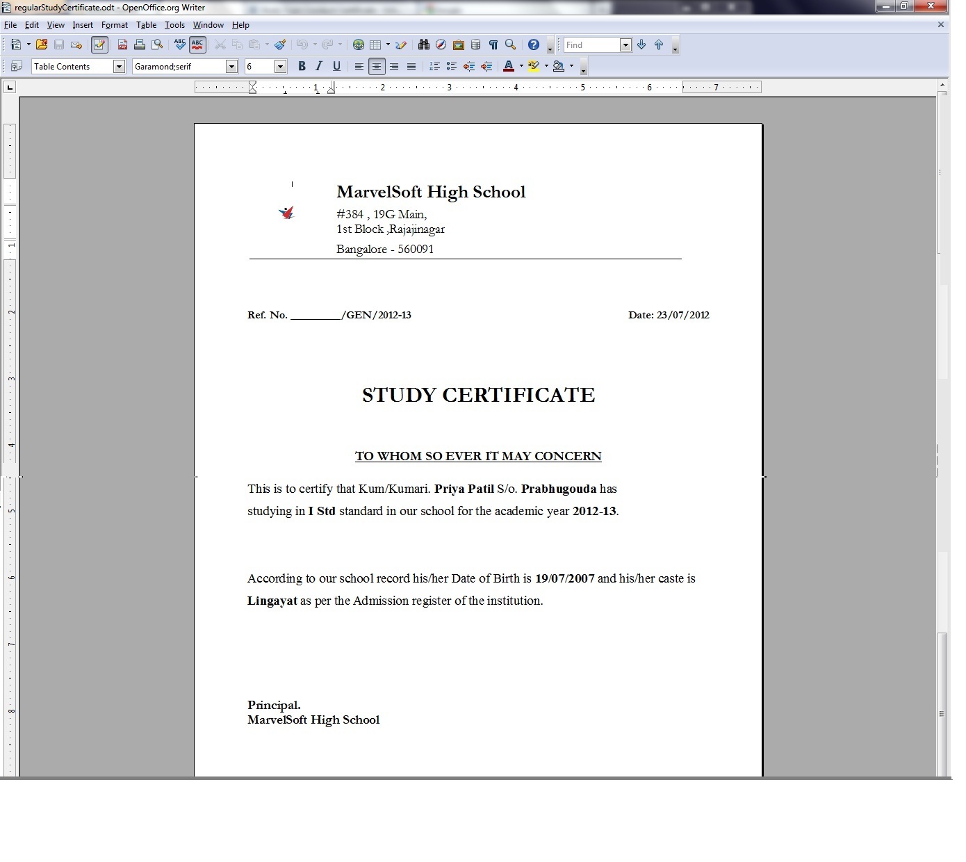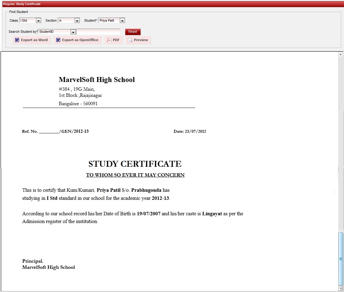 Click on Preview, you can see the preview of the Regular study certificate as shown below.