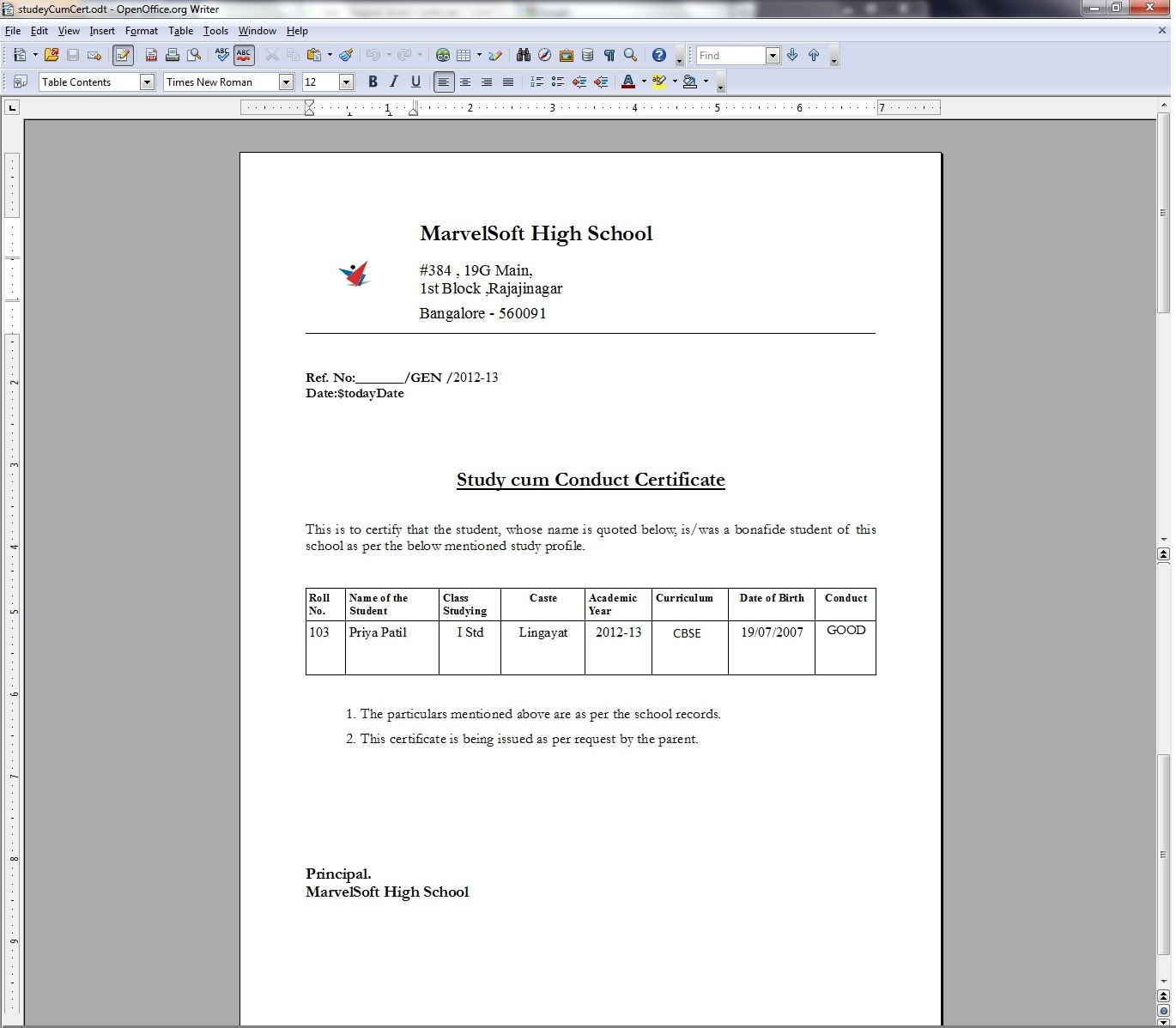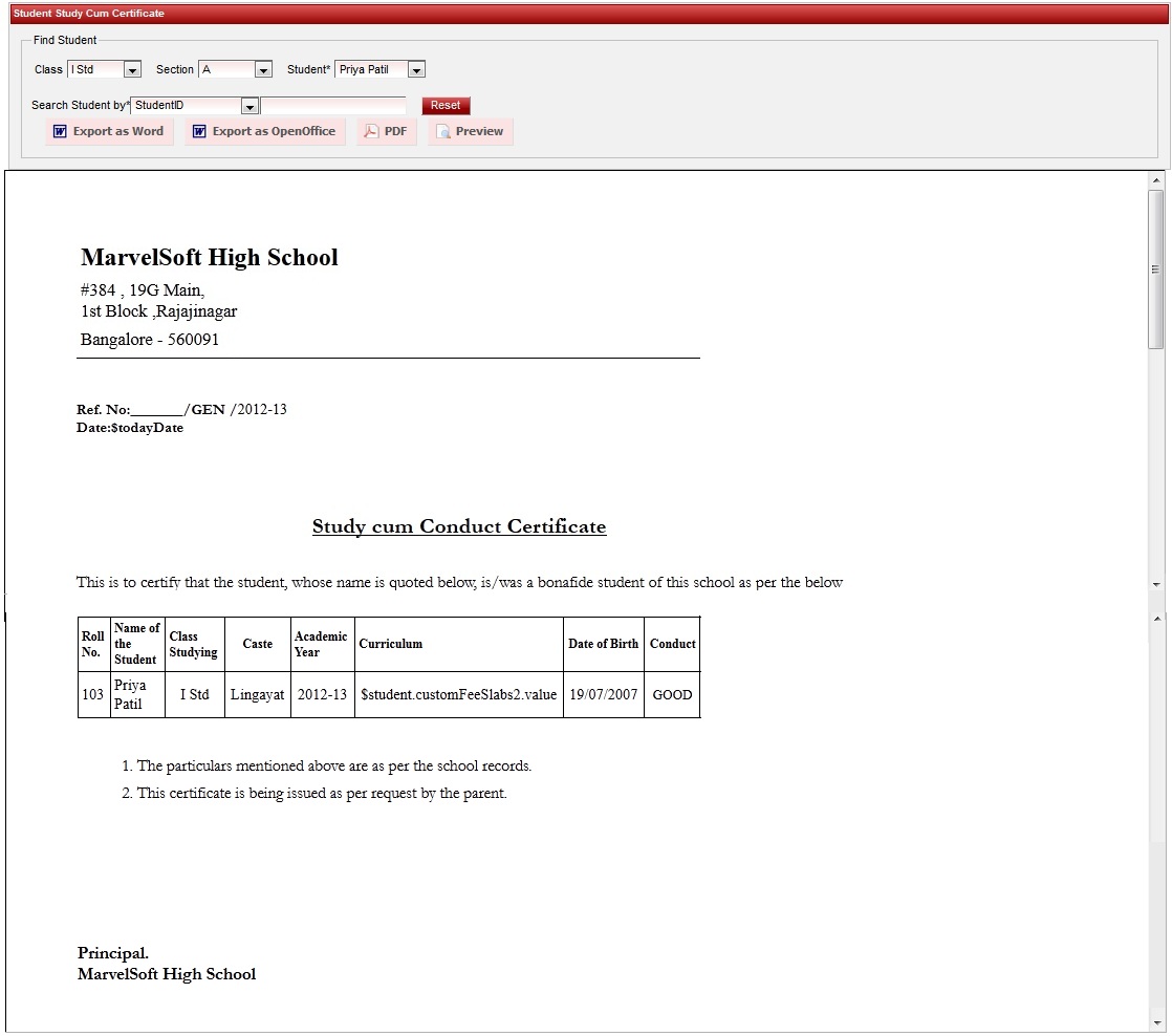 Click on Preview, you can see the preview of the Study cum conduct certificate as shown below.