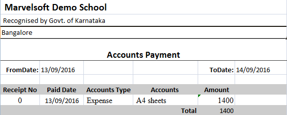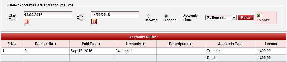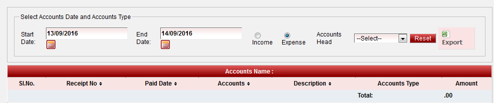 Select the Start Date, End Date, Income/Expense, Account Head. The data will be displayed below automatically.