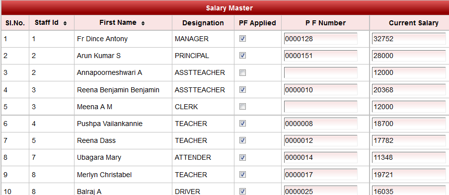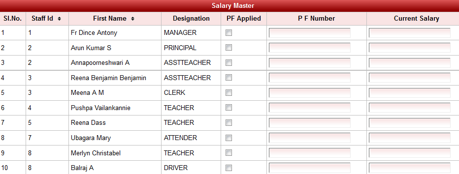 Now you can enter the salary of all the employees. If the employee if applicable for then check on "PF Applied" and enter "P F Number".