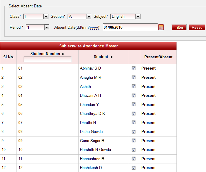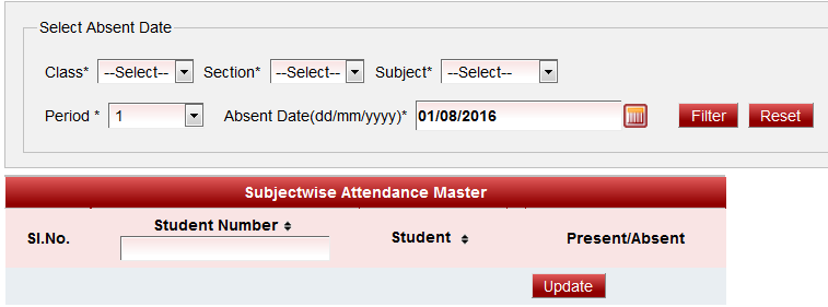 | Select Class, Section, Subject, Period, Date and click on "Filter". All the student will be displayed under.
