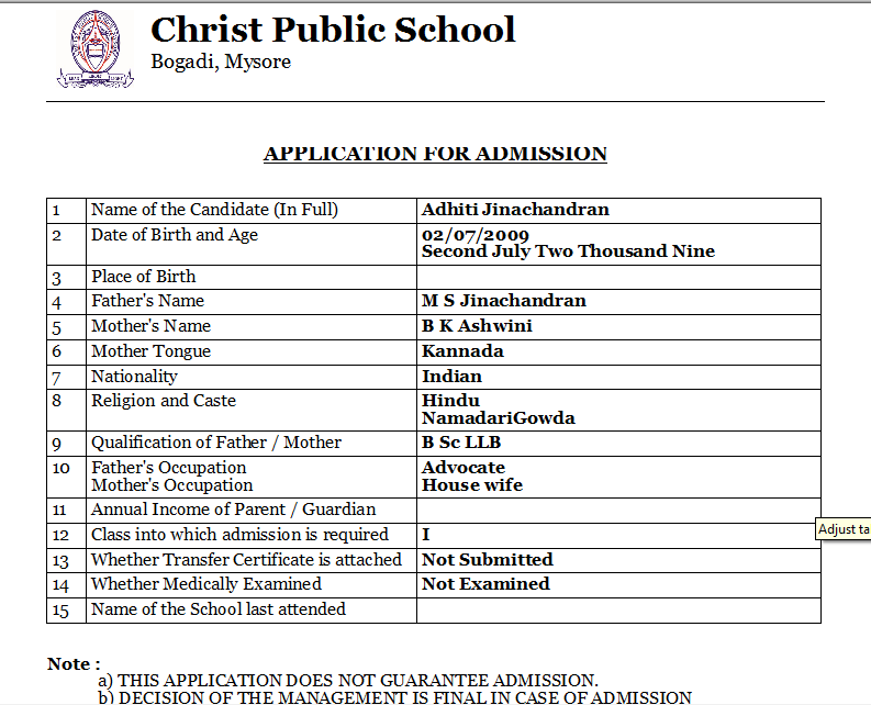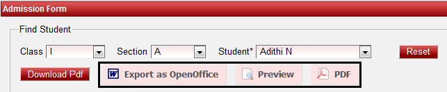Select Class, Section and Student name (for whom you want to check the admission form) and click on Preview. If you want to view in PDF format, then click on PDF or if you want to keep in Open Office Format( Similar to Word Format) then click on "Export to OpenOffice".