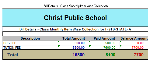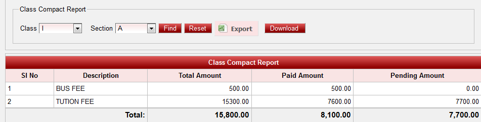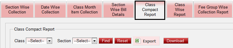 Class Compact Report is used to check how much collection of each and every fees is done. This report is class wise.