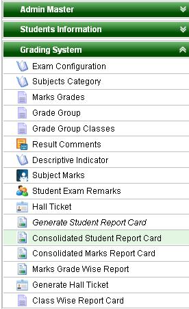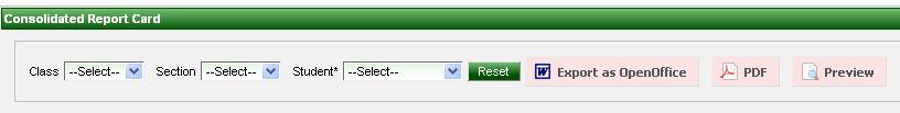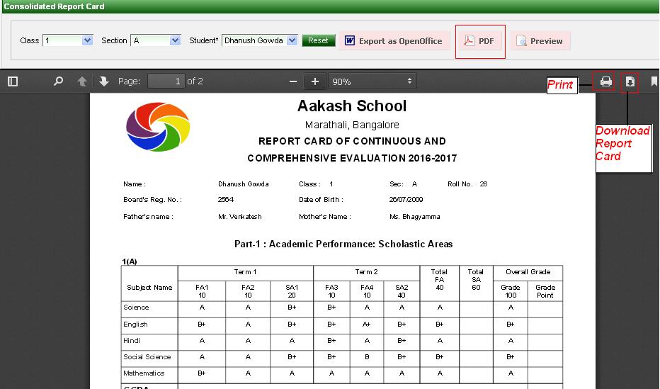 Consolidated report card helps you to generate the overall grades scored by a particular student in all the subjects by consolidating all the tests and term marks. |