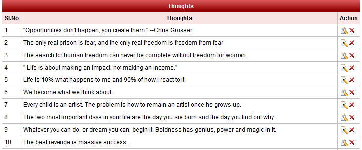 Step 2: Once you click on Thoughts menu in widget drop down list, thoughts master will be opened as shown below.