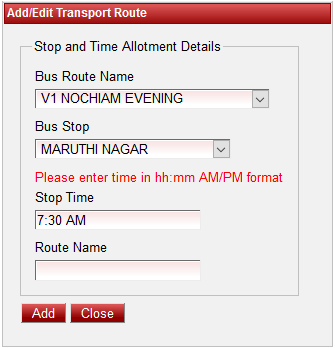 Finally, Click on Add button to create a Transport Route. Once the data is saved you will see a Transport Route Successfully added message. Repeat the above steps to add all the Transport Route. Once all the Transport Route are added click on Close button to close the Add/Edit window.